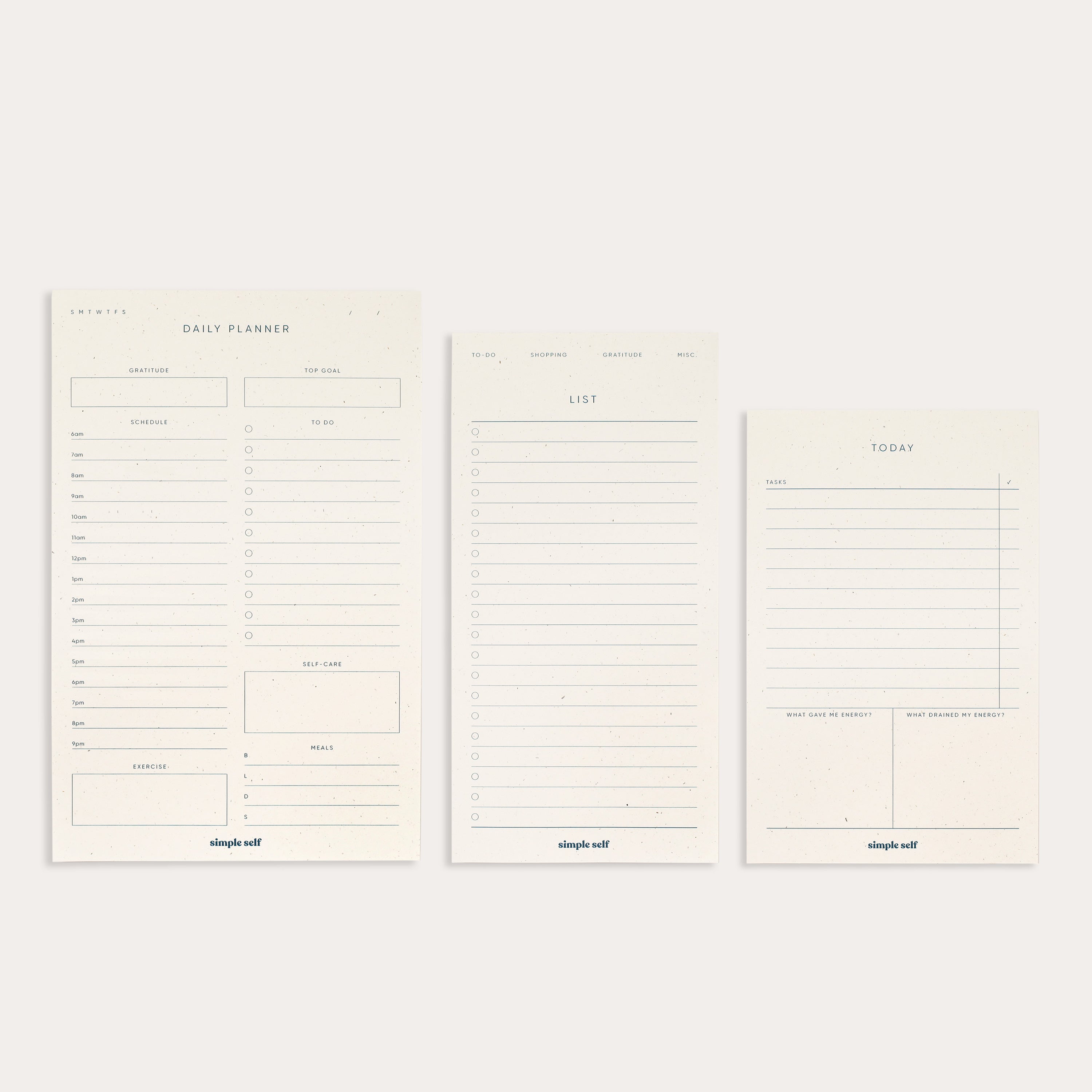 The Minimalist Notepad Bundle ($56 value) includes the Daily Planner Notepad, the Today Notepad, and the List Notepad. Cream paper and blue text are used to be gentle on the eyes and promote a sense of calm. Made in Los Angeles, California using 70lb recycled paper.
