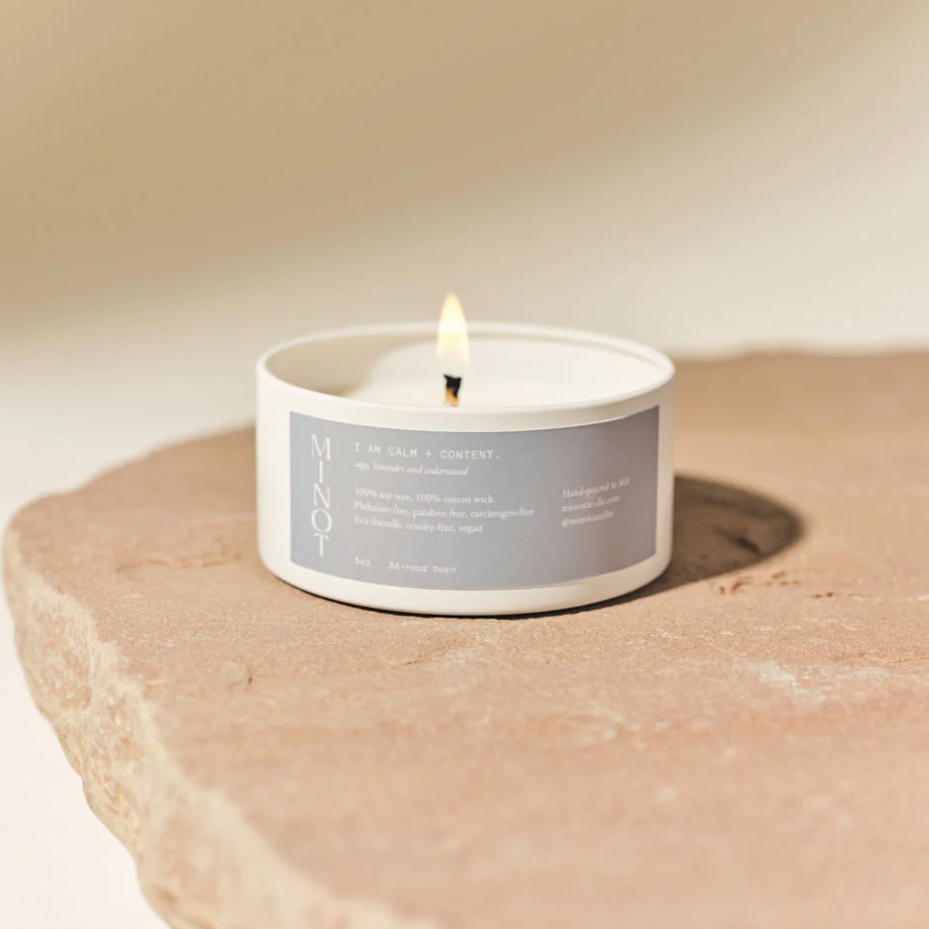 'I am Calm + Content Candle' by Minot Candle ($22 value) - Sage, lavender and cedarwood blend for a clean, calm scent. Sustainably sourced, non-toxic, and hand-poured.