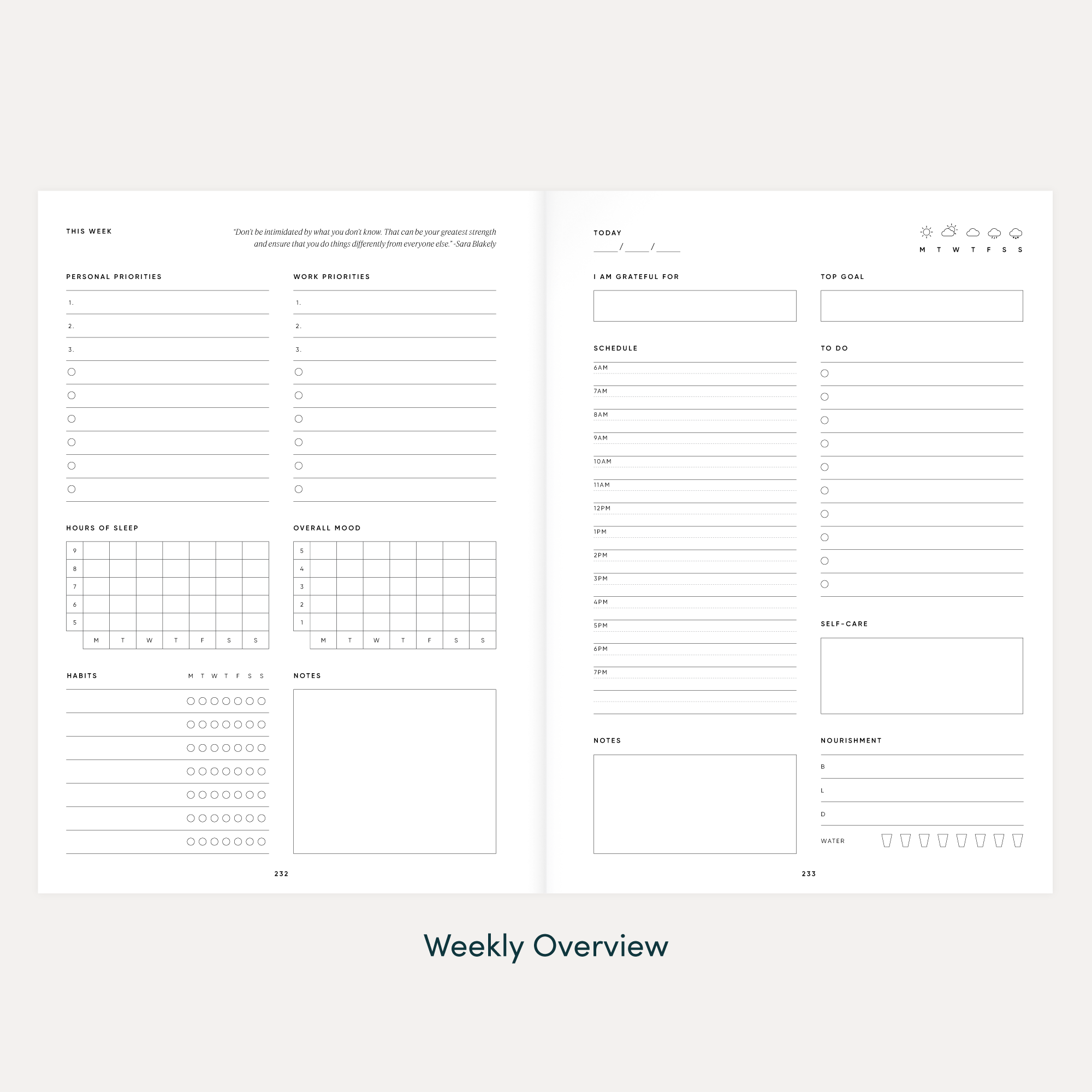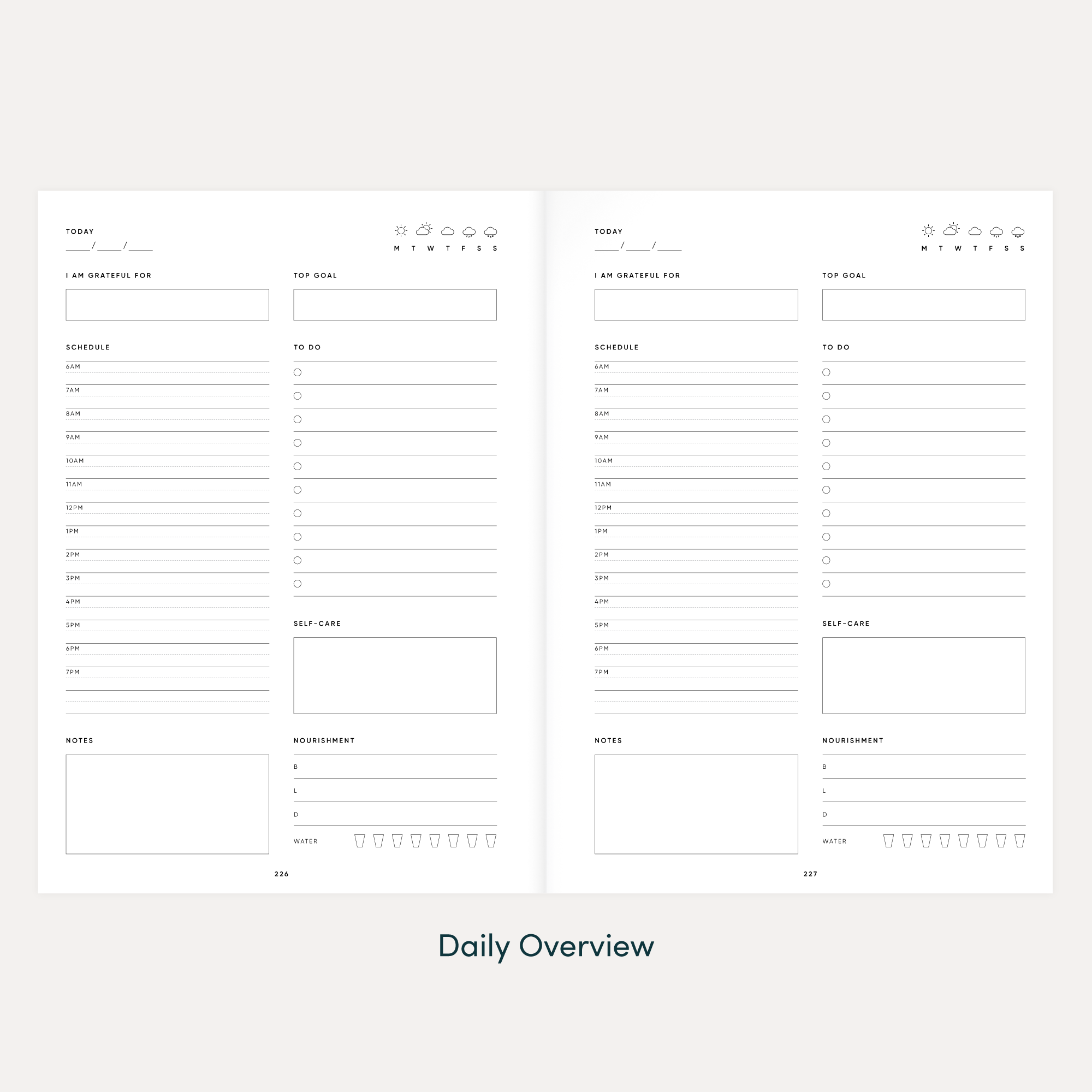 The #1 wellness planner, sustainably made and thoughtfully designed in Los Angeles, California. Prioritize the activities that fill up your cup so that you are in the best position to achieve your goals. The Self-Care Planner was designed using positive psychology to help you mindfully plan and schedule your day, week, and month, while feeling healthy and happy every step of the way. This holistic planner includes space to track and plan meals, daily habits, sleep and mood patterns, water intake, and more. Recommended by Oprah Daily, Forbes, and Glamour (just to name a few!). The Self-Care Planner, Daily Edition is a 6-month, undated planner.
